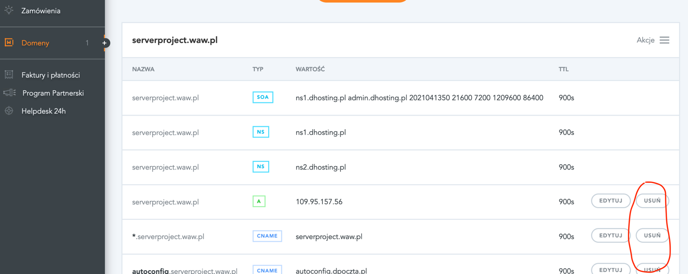 - The DNS zone usually contains default entries. Clear them to avoid confusion by clicking the DELETE button next to each one.