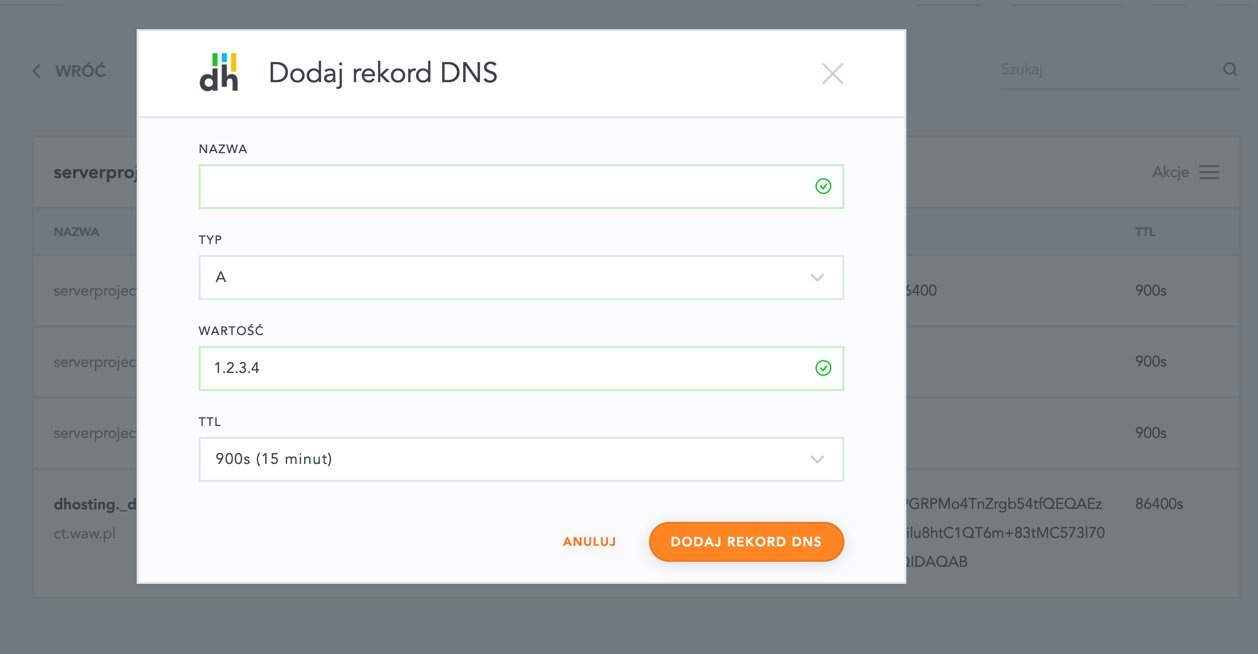 1.2.3.4. Leave the NAME field empty. Confirm by clicking ADD DNS RECORD.
