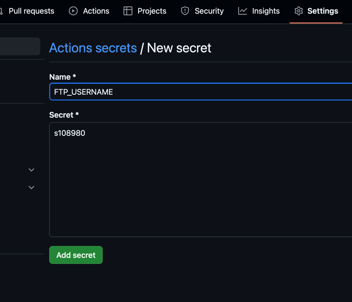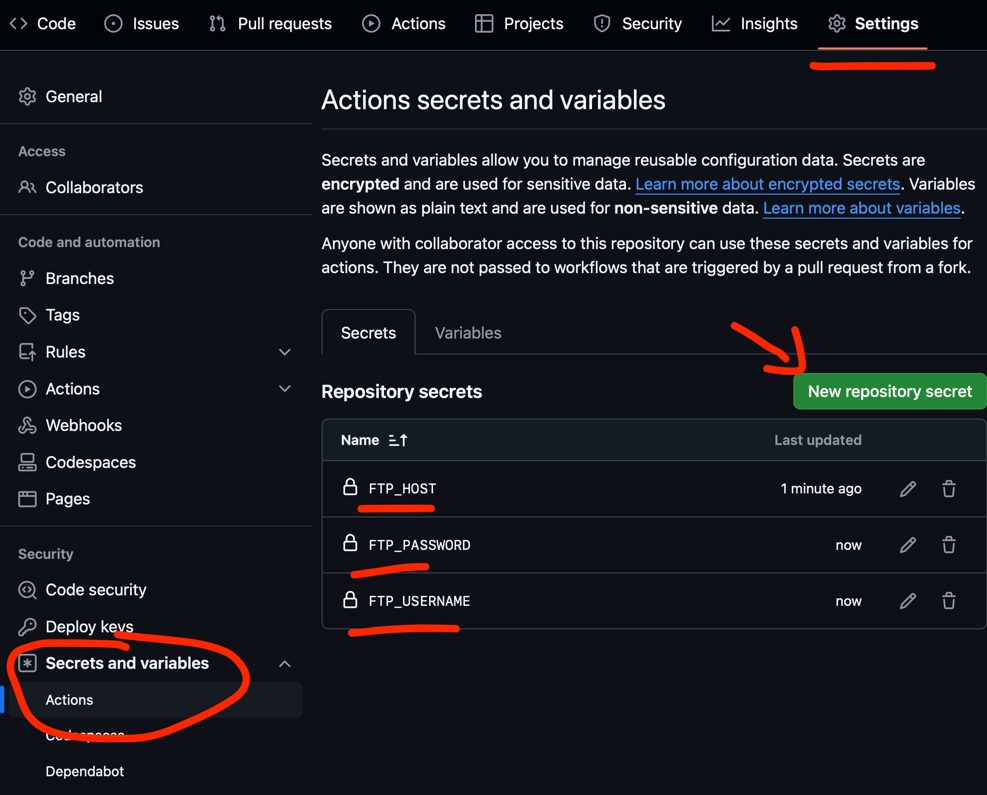 Go to the repository settings on Github (Settings -> Security -> Secrets -> Actions) and add FTP login data according to the pattern: