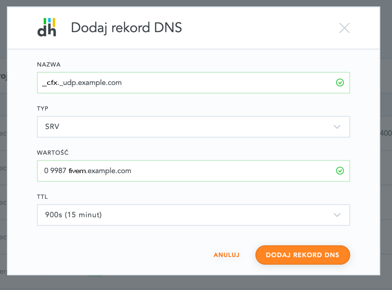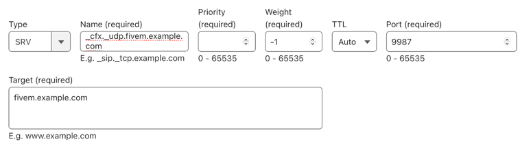 Add an SRV record named _cfx._udp with the value: 0 9987 fivem.example.com.