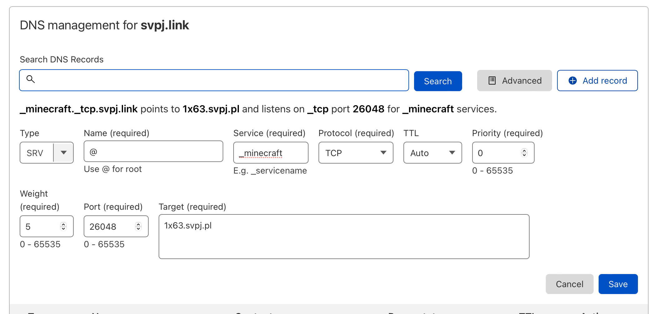 Below are examples of adding a Minecraft server domain at example DNS service providers, assuming