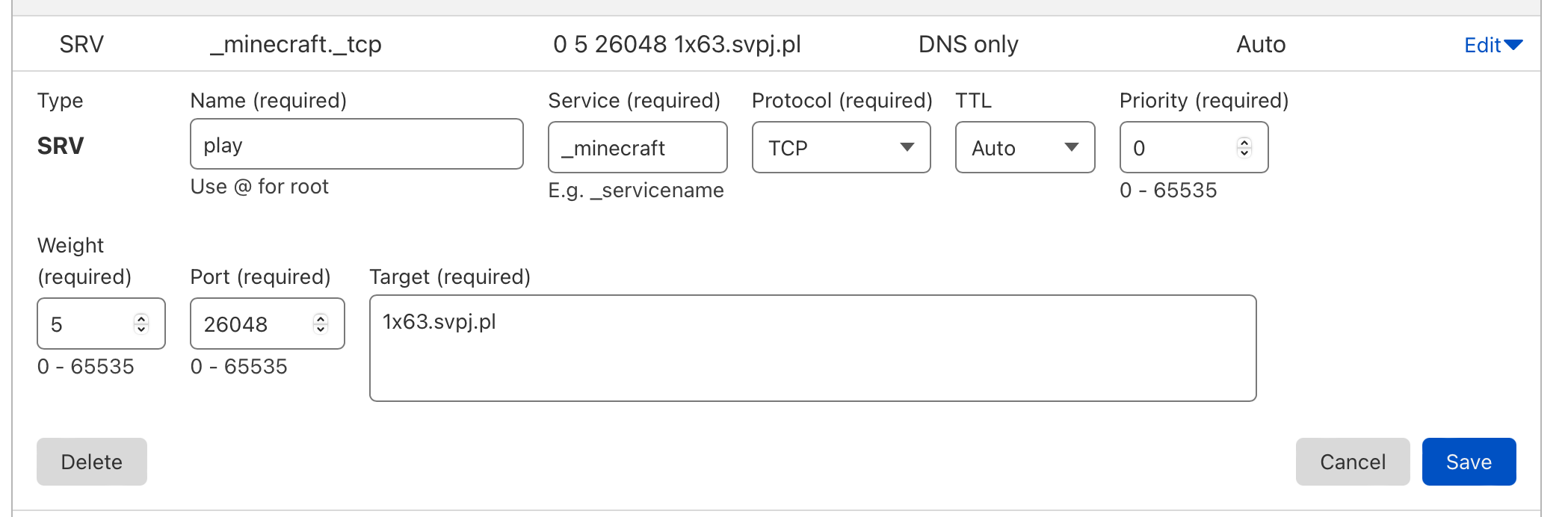 To configure a Minecraft domain, you need to add one SRV record to its DNS zone with the parameters: