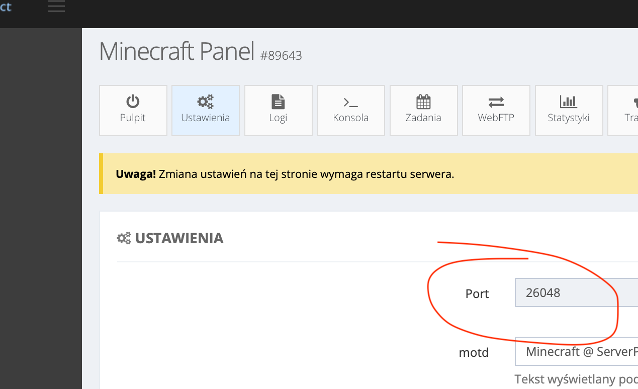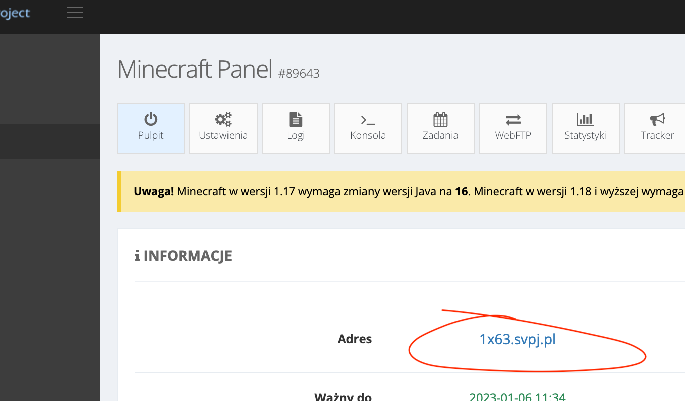 the server's domain address is 1x63.svpj.pl, and the port is 26048.