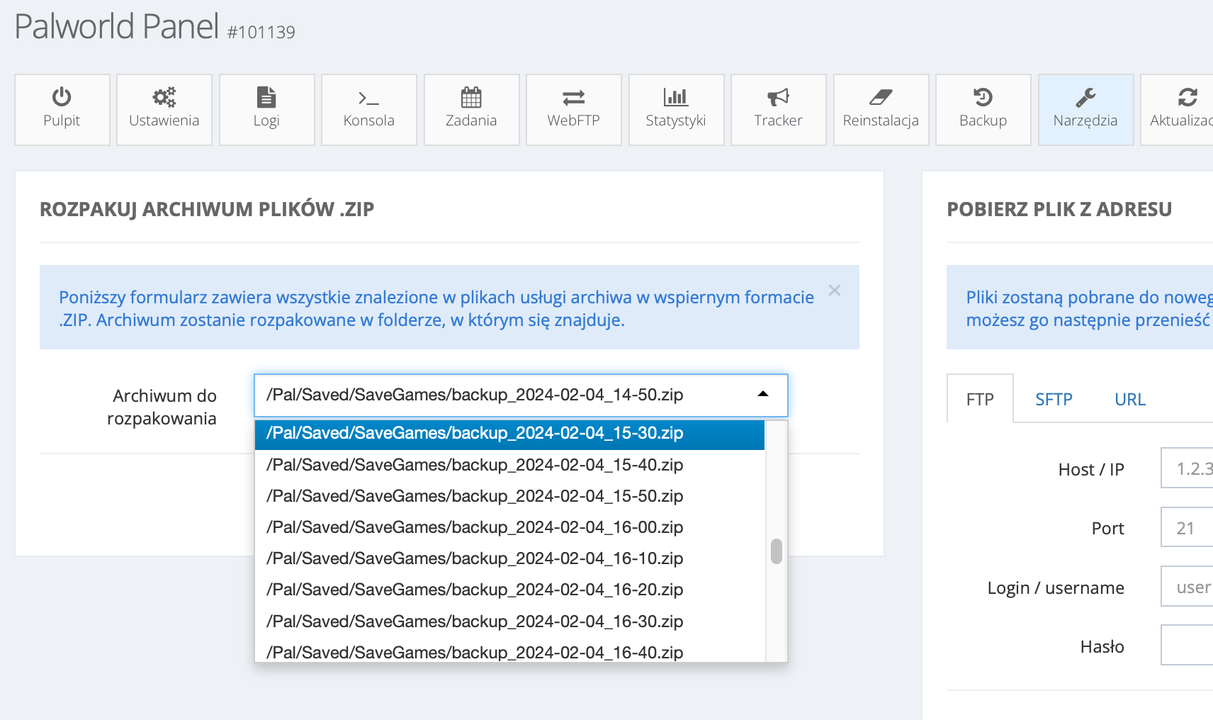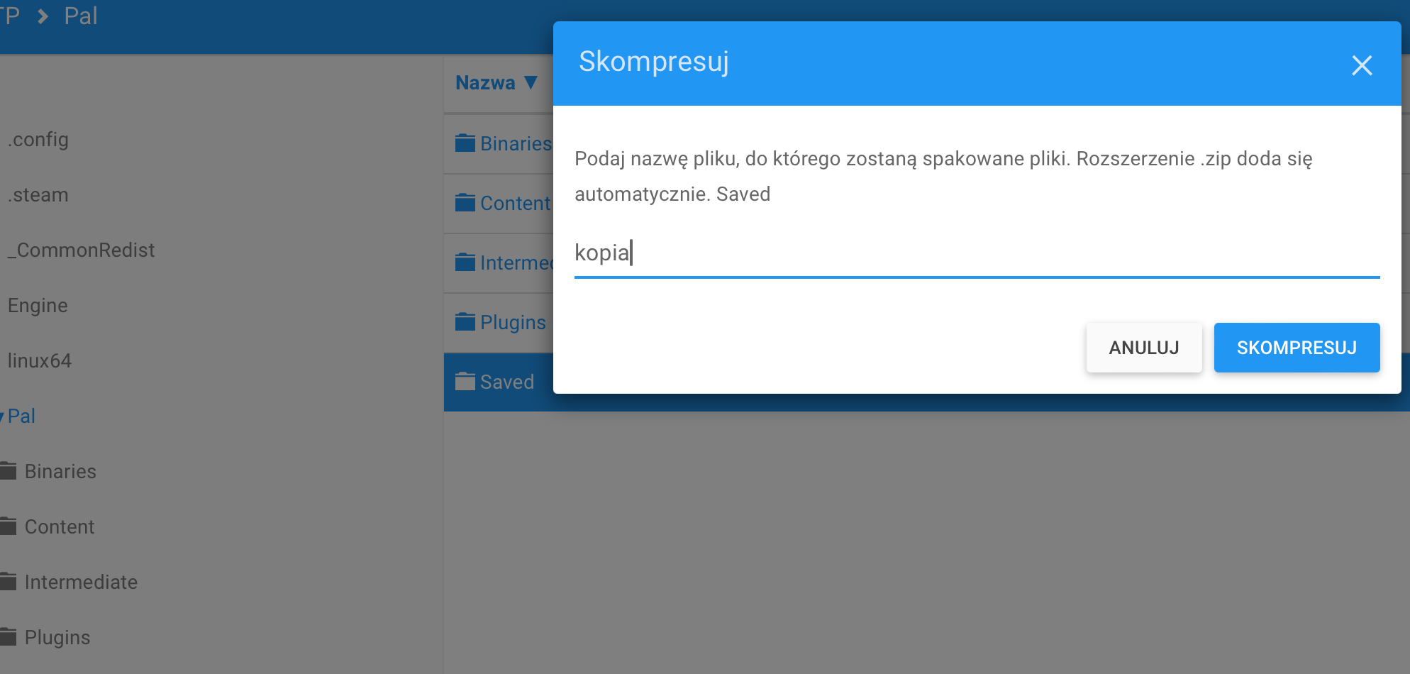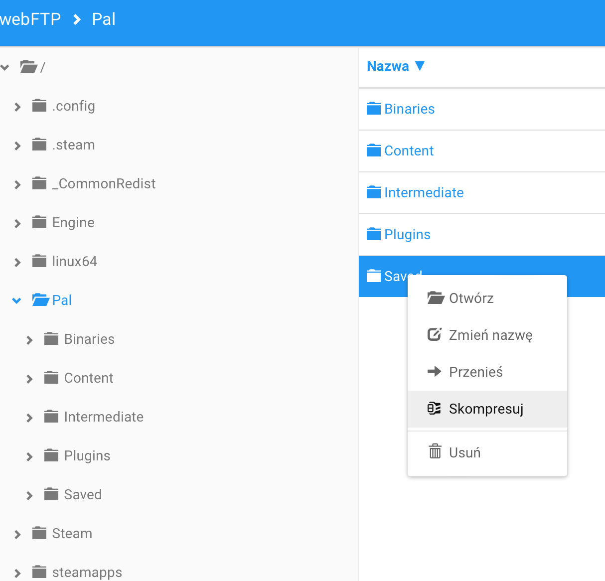 To make a backup, log in to FTP and download the Pal/Saved directory.